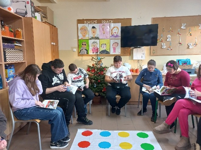 Jednym z działań, które promują i wspierają rozwój czytelnictwa wśród dzieci i młodzieży było zorganizowanie, wspólnie z panią psycholog i logopedą w kl.2 szkoły przysposabiającej do pracy, zajęć omawiających wpływ czytania książek na rozwój młodzieży. Zajęcia opierały się na tekście pochodzącym z książki zakupionej w ramach Narodowego Programu Rozwoju Czytelnictwa 2.0 pt.: „Jesteśmy różni. Bajki, które wzmacniają samoocenę”.
