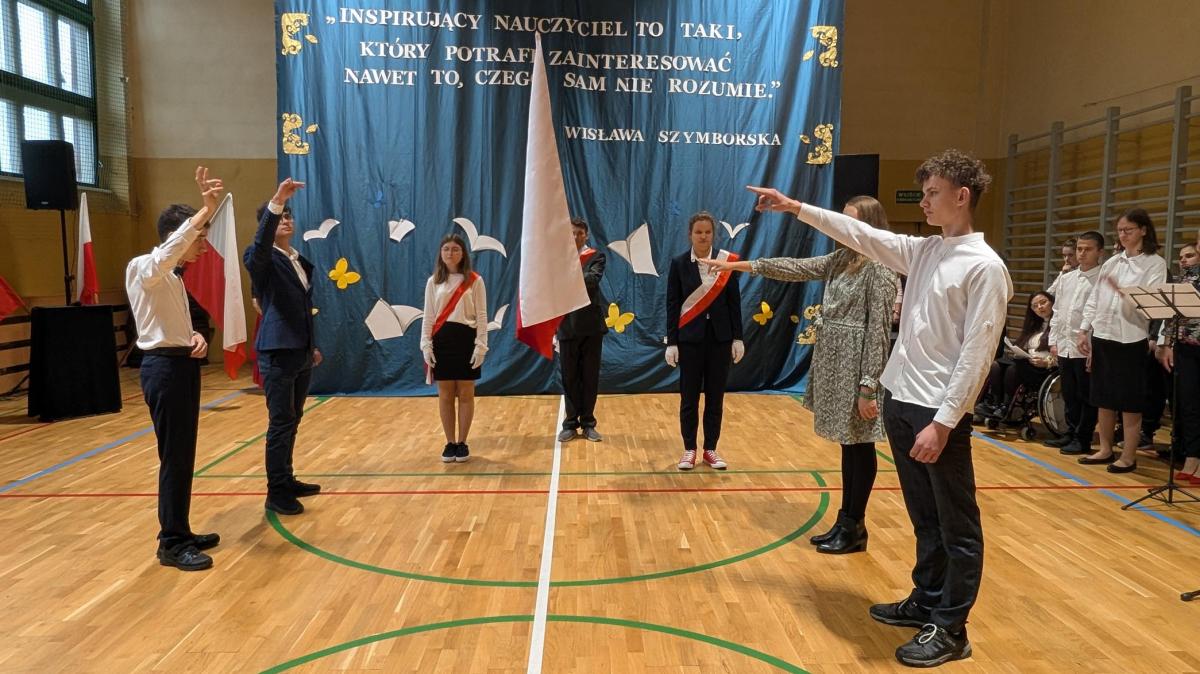 Z okazji Dnia Edukacji Narodowej w naszej szkole odbyła się wyjątkowa uroczystość, podczas której z szacunkiem i wdzięcznością uczciliśmy wszystkich nauczycieli oraz pracowników szkoły. Akademię rozpoczęło uroczyste ślubowanie uczniów klas pierwszych – z dumą i powagą zostali oni oficjalnie przyjęci do społeczności szkolnej.