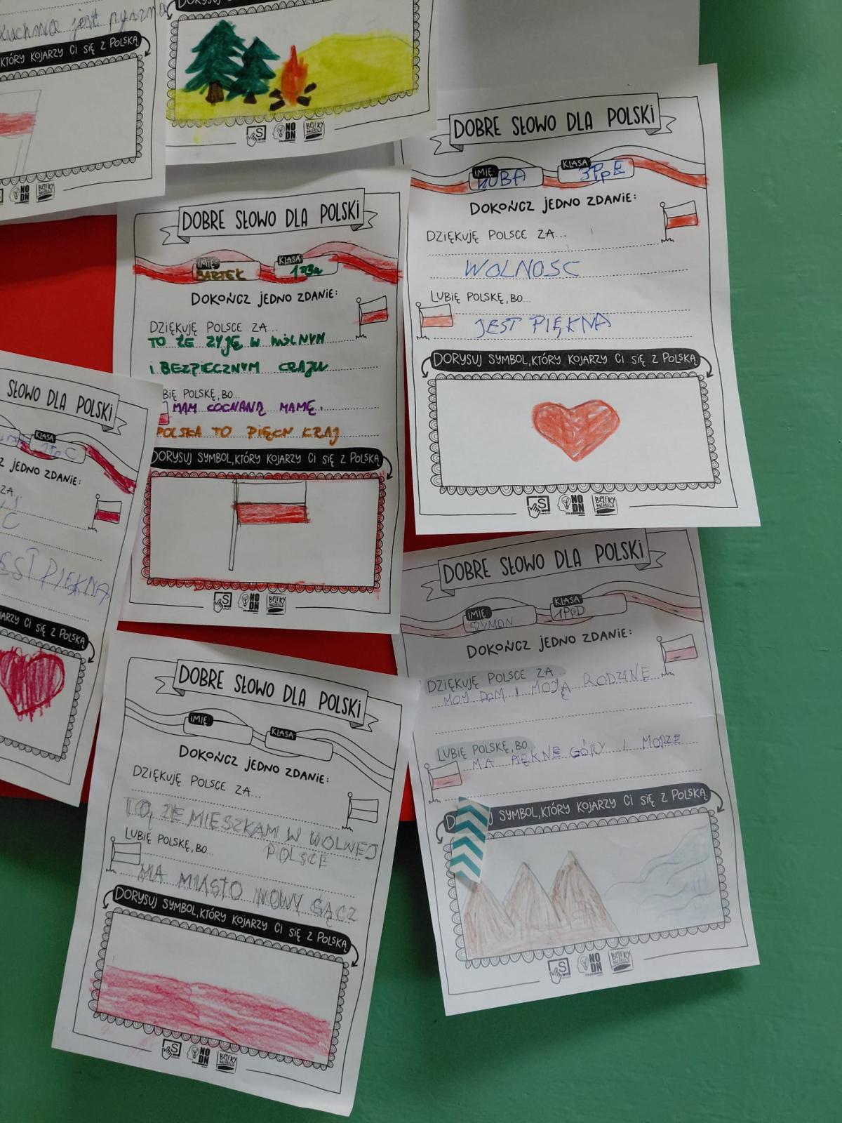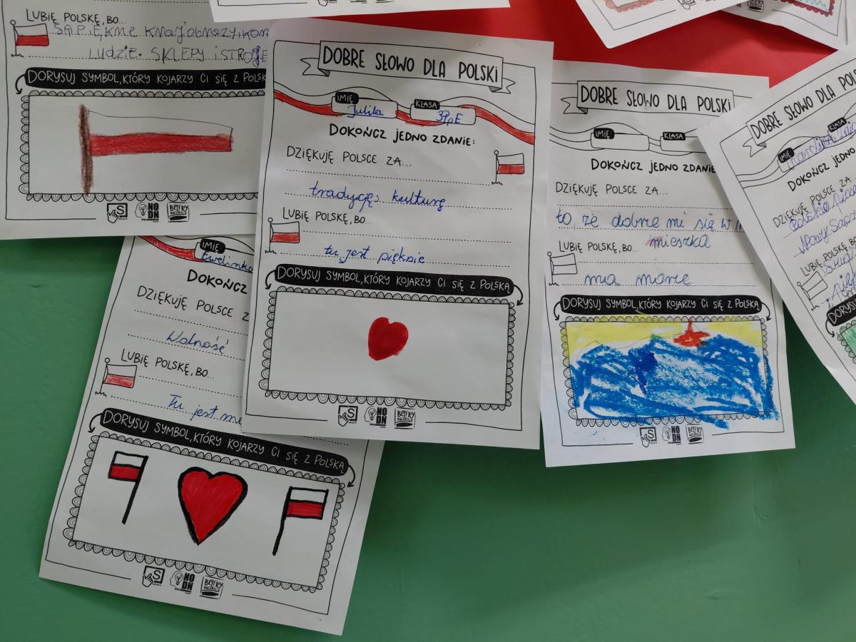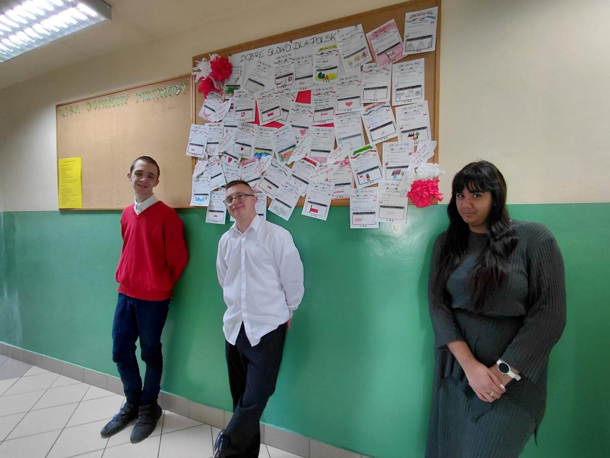 Z okazji Święta Niepodległości uczniowie Szkoły Przysposabiającej do Pracy wzięli udział w szkolnej akcji "Dobre słowo dla Polski". Na kartkach pisali i rysowali za co chcą podziękować i za co lubią swoją ojczyznę. Na korytarzu budynku B powstała "ściana wdzięczności" - gazetka z karteczkami uczniów, tworząca piękną i żywą galerię pozytywnych emocji wobec Ojczyzny.