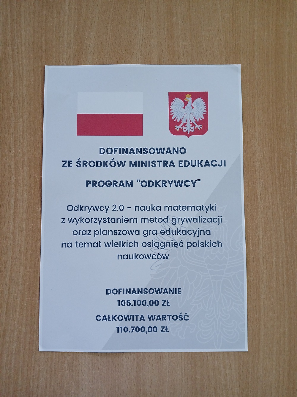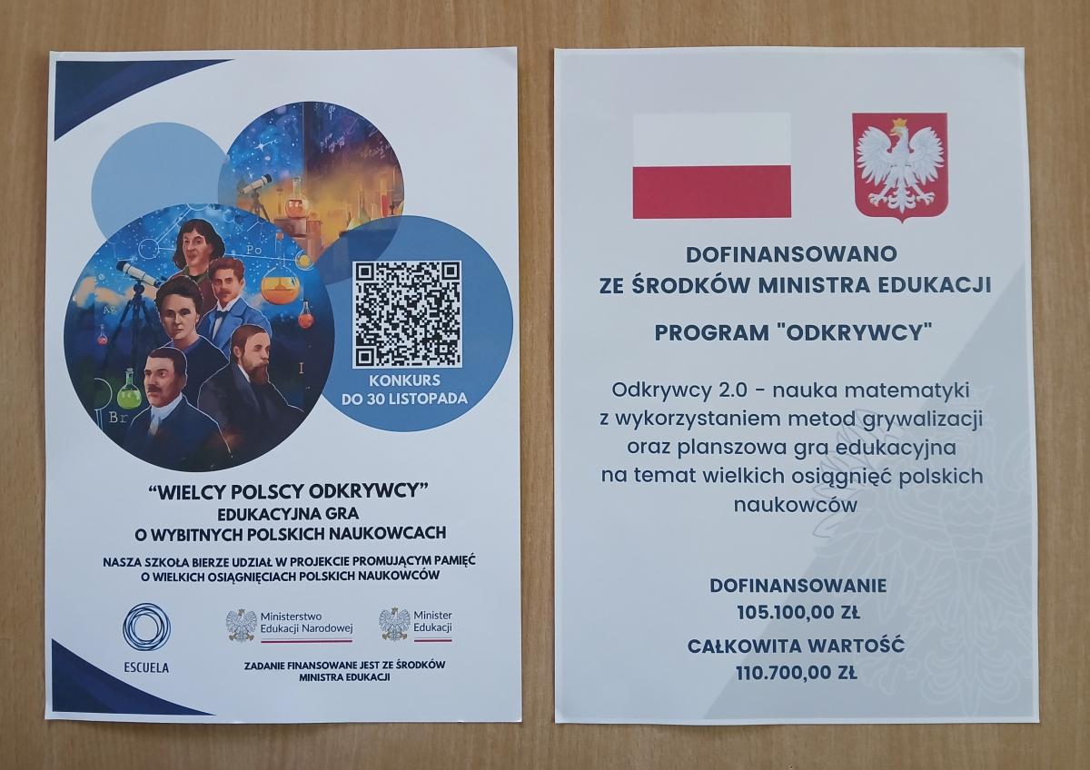 Nasza szkoła bierze udział w projekcie „Odkrywcy 2.0 – nauka matematyki z wykorzystaniem metod grywalizacji oraz planszowa gra edukacyjna na temat wielkich osiągnięć polskich naukowców”, realizowanym przez Fundację Escuela w ramach programu „Odkrywcy”. W ramach projektu otrzymaliśmy egzemplarze gry edukacyjnej „Wielcy Polscy Odkrywcy”. Projekt ma na celu popularyzowanie wiedzy o najwybitniejszych polskich naukowcach, takich jak Maria Skłodowska-Curie, Jan Czochralski czy Ignacy Łukasiewicz, promocję polskiej nauki, innowacji i kreatywności, inspirowanie młodego pokolenia do odkrywania świata w duchu ciekawości, współpracy i szacunku dla osiągnięć wielkich Polaków.