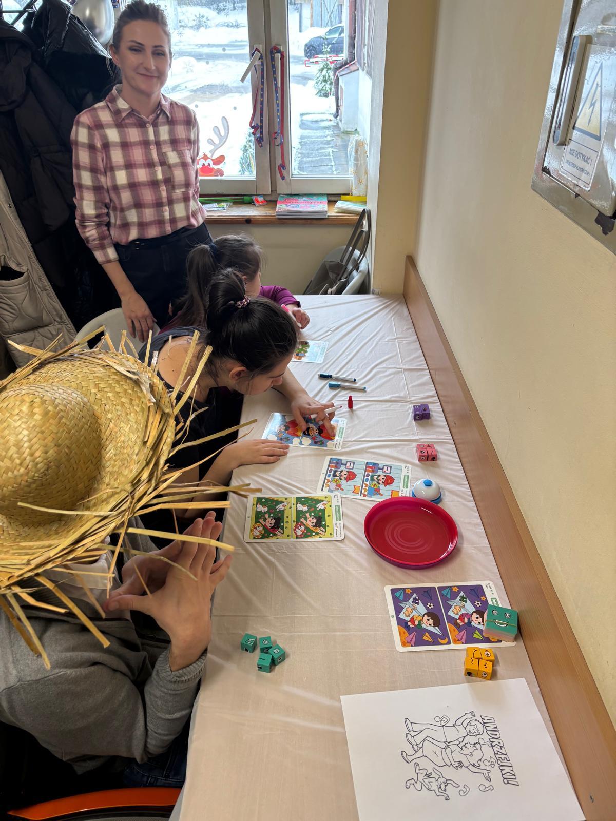 Na szkolnym korytarzu pani Natalia oraz pani Kasia przygotowały dla uczniów zestaw gier i zabaw, w których można było wziąć udział i zdobyć drobne nagrody.