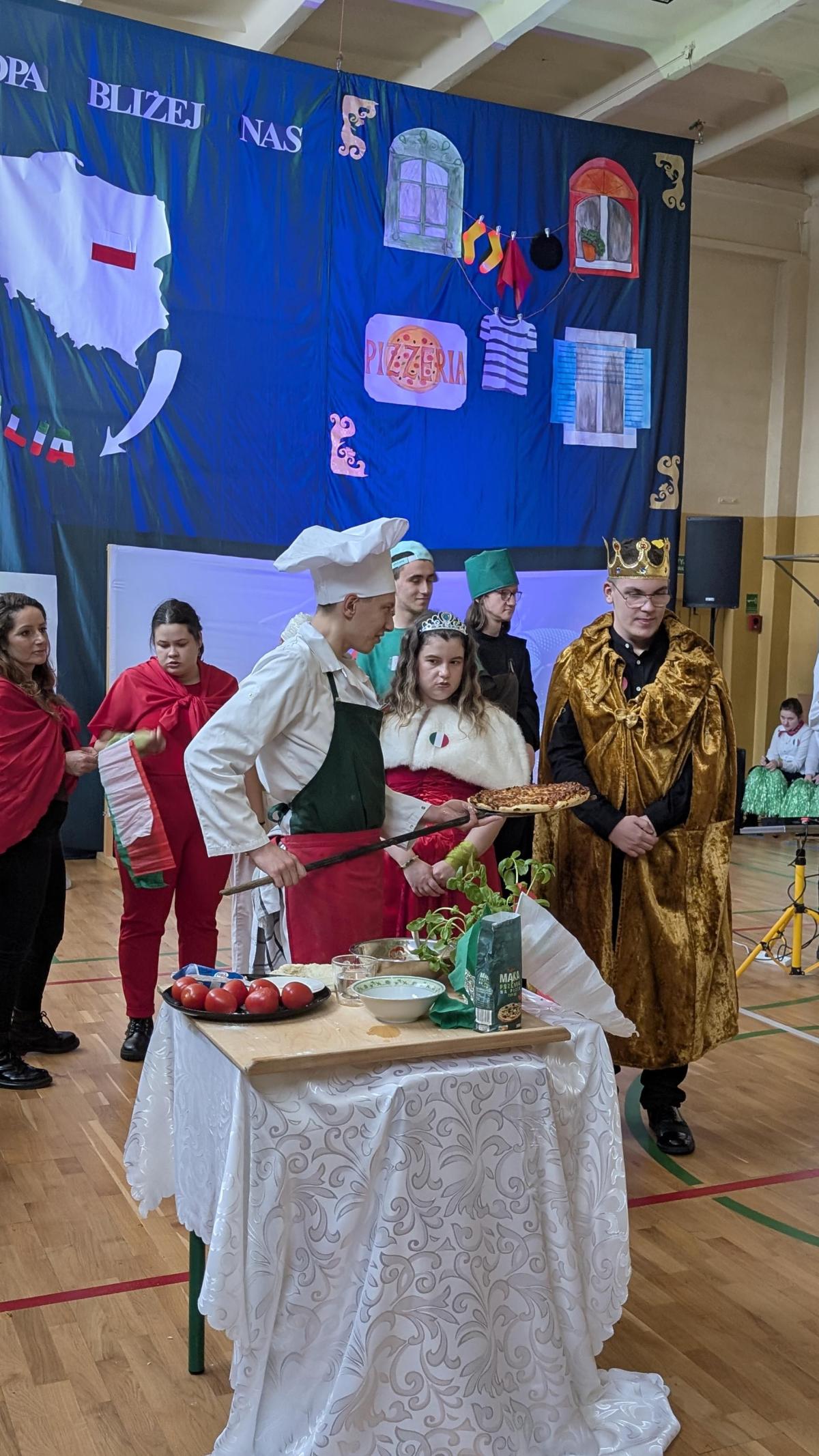 25 listopada 2025 r. sala gimnastyczna naszej szkoły wypełniła się kolorami, muzyką i zapachem włoskiej kuchni. Tego dnia odbyło się uroczyste spotkanie podsumowujące realizację trzeciej części innowacji pedagogicznej „Europa bliżej nas – Włochy”, którego celem było przybliżenie uczniom kultury, tradycji, języka oraz kulinarnego dziedzictwa słonecznej Italii.