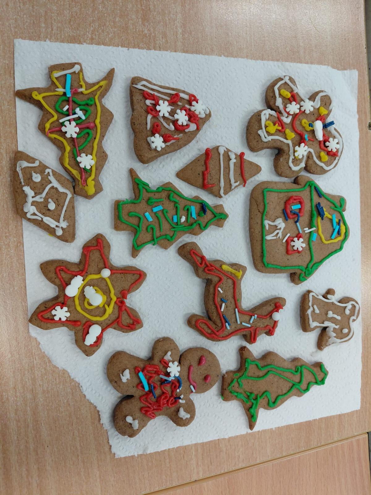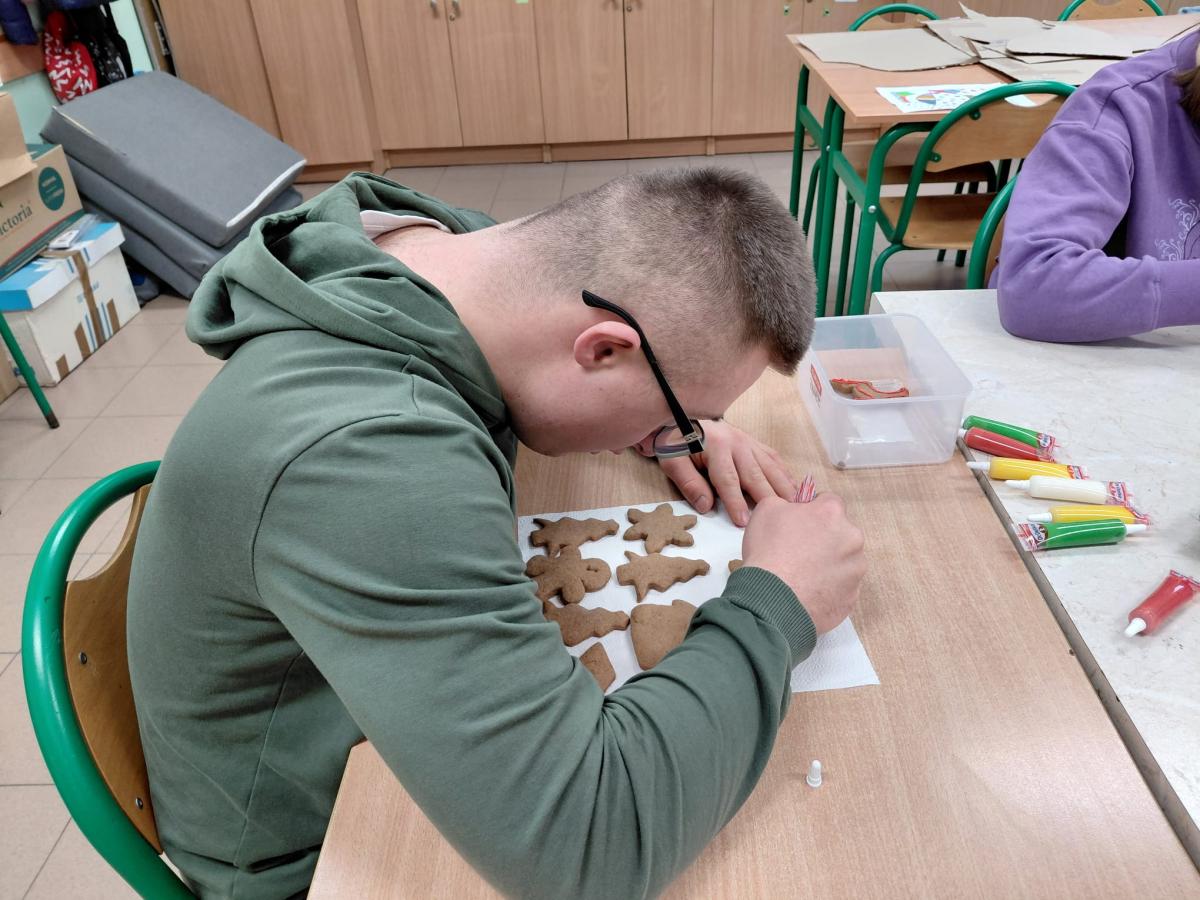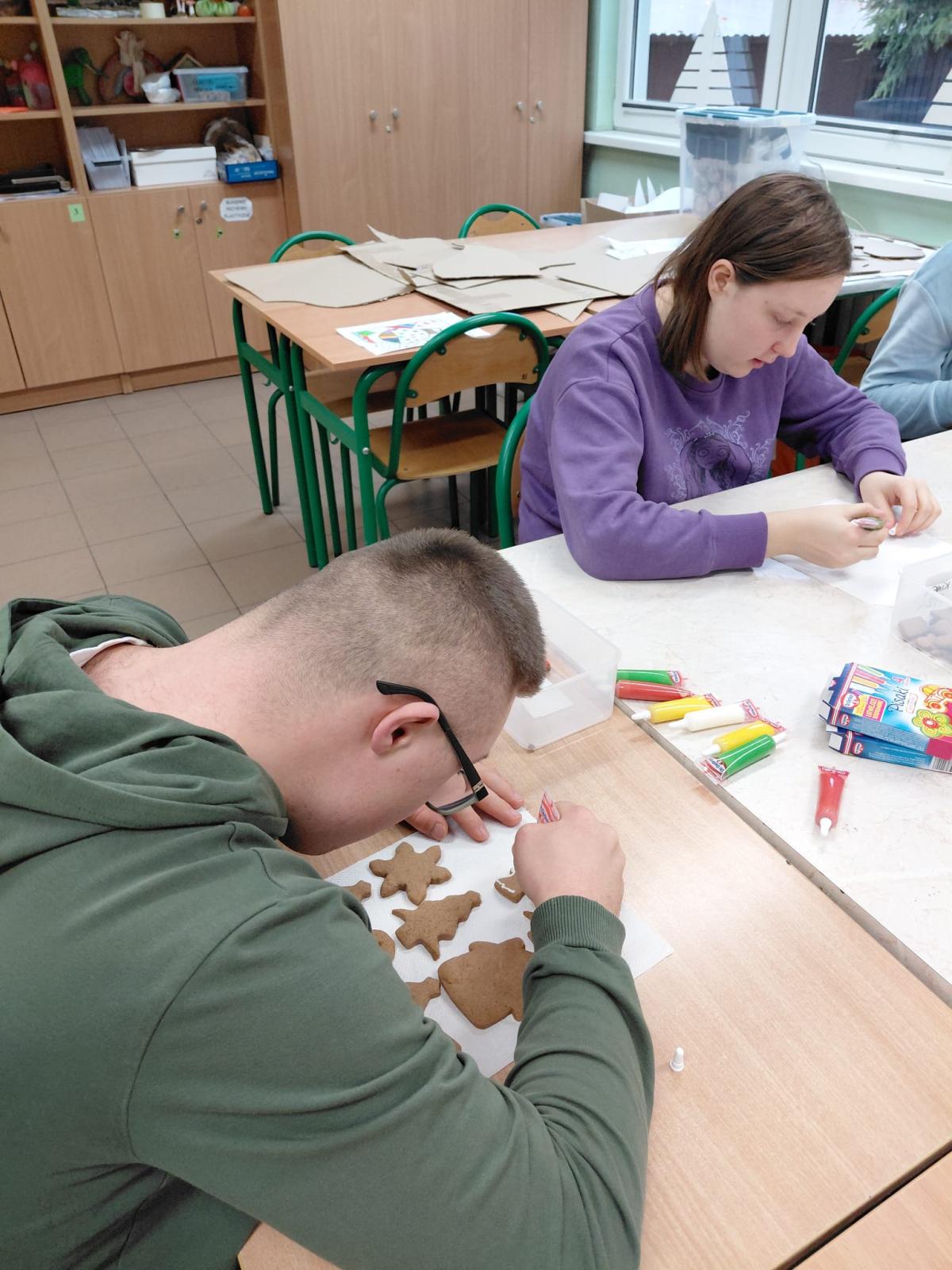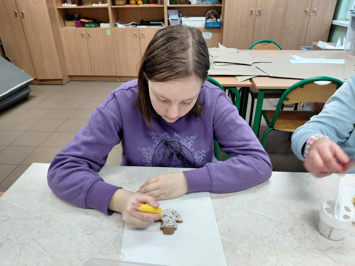 W ramach modułu 8 uczniowie podczas wspólnego dekorowania pierniczków rozwijali umiejętności porozumiewania się, wzmacniali wzajemne relacje i praktykowali stosowanie form grzecznościowych, wymieniając się kolorowymi pisakami i posypkami do dekoracji ciasteczek. Efektem ich dobrej współpracy są piękne, kolorowe, świąteczne pierniczki.