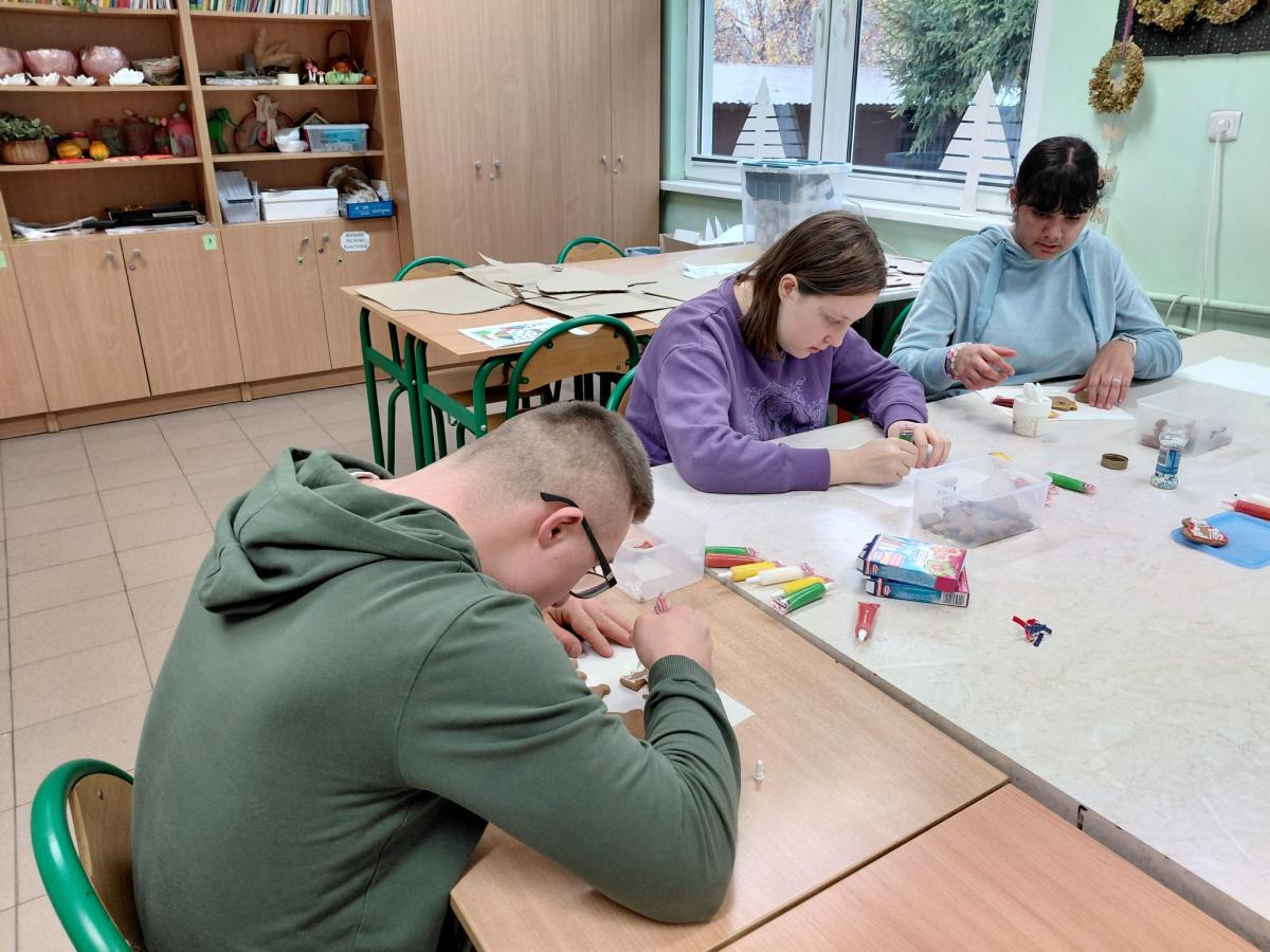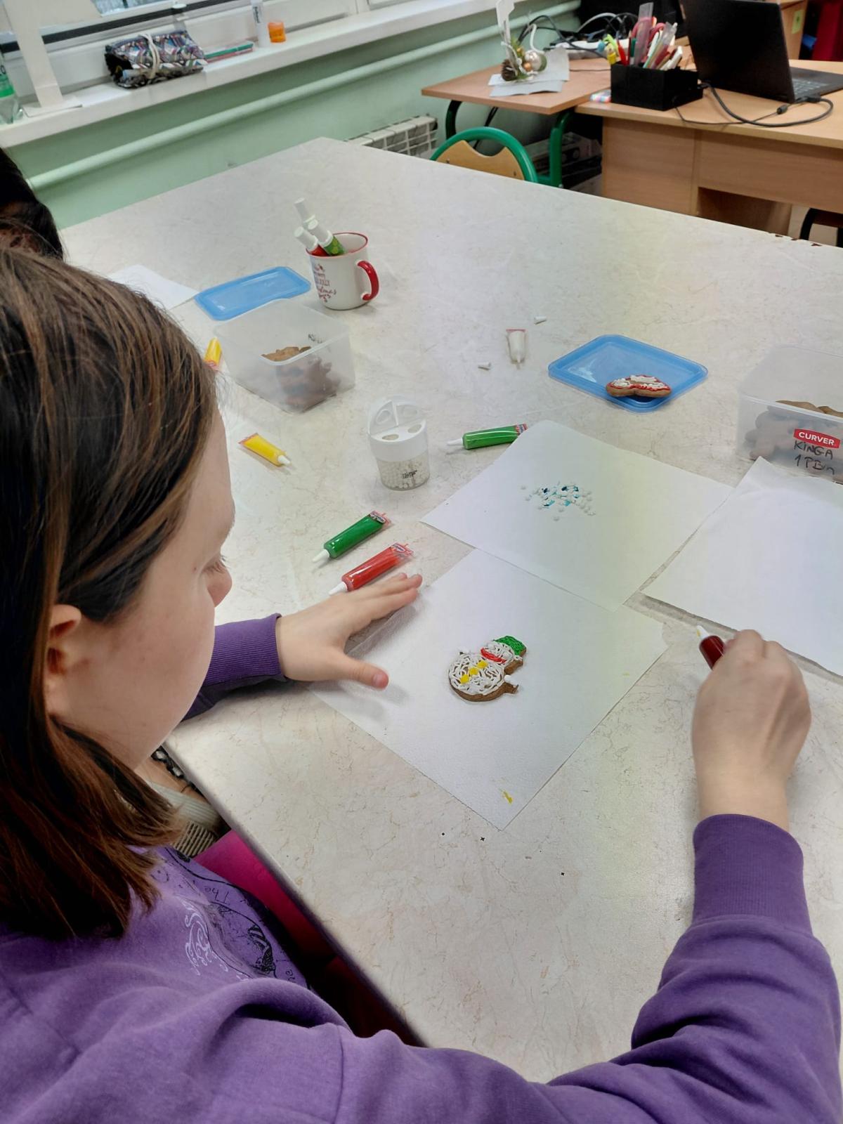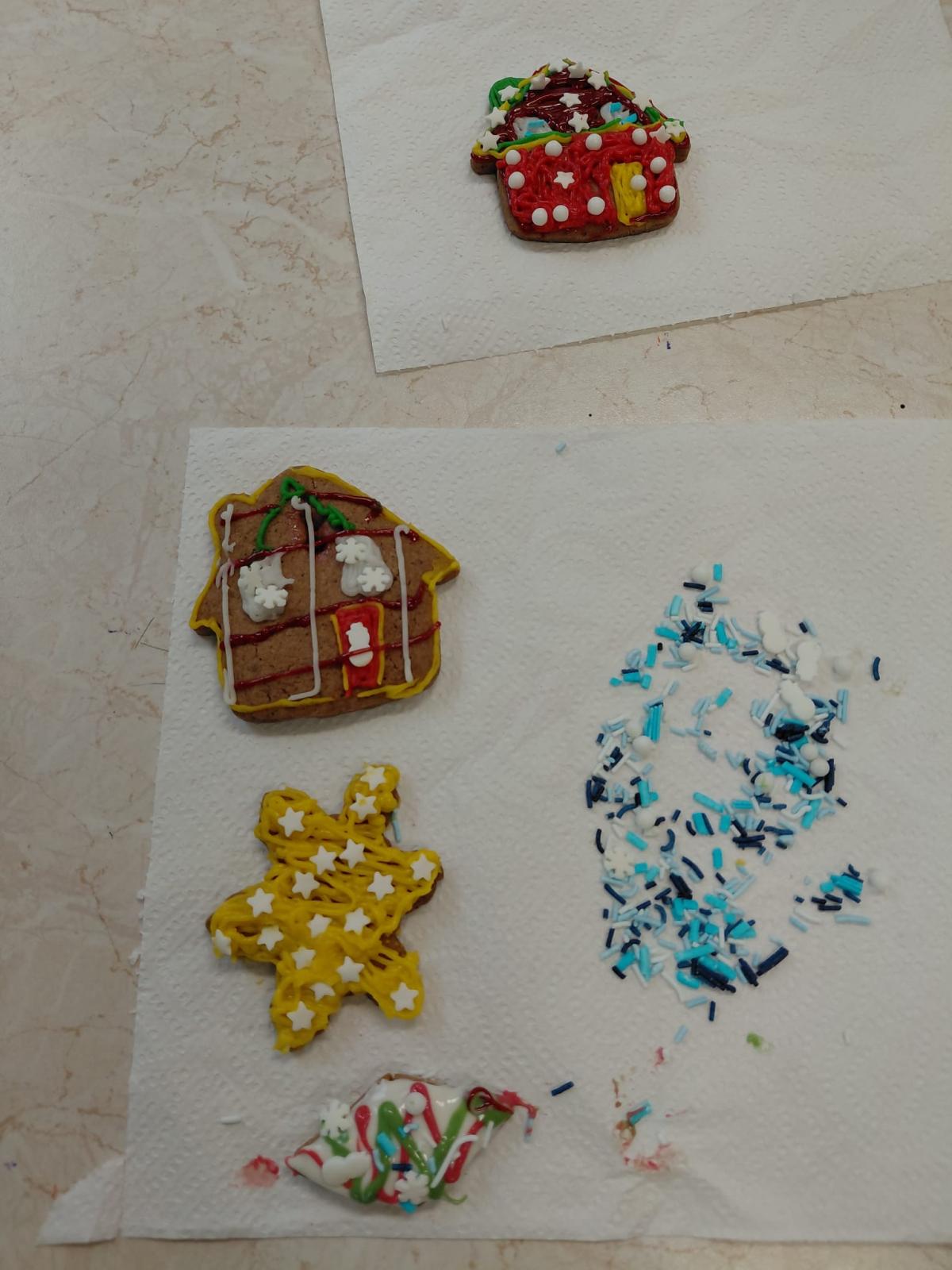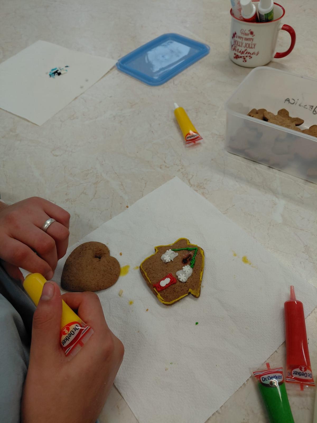 W ramach modułu 8 uczniowie podczas wspólnego dekorowania pierniczków rozwijali umiejętności porozumiewania się, wzmacniali wzajemne relacje i praktykowali stosowanie form grzecznościowych, wymieniając się kolorowymi pisakami i posypkami do dekoracji ciasteczek. Efektem ich dobrej współpracy są piękne, kolorowe, świąteczne pierniczki.
