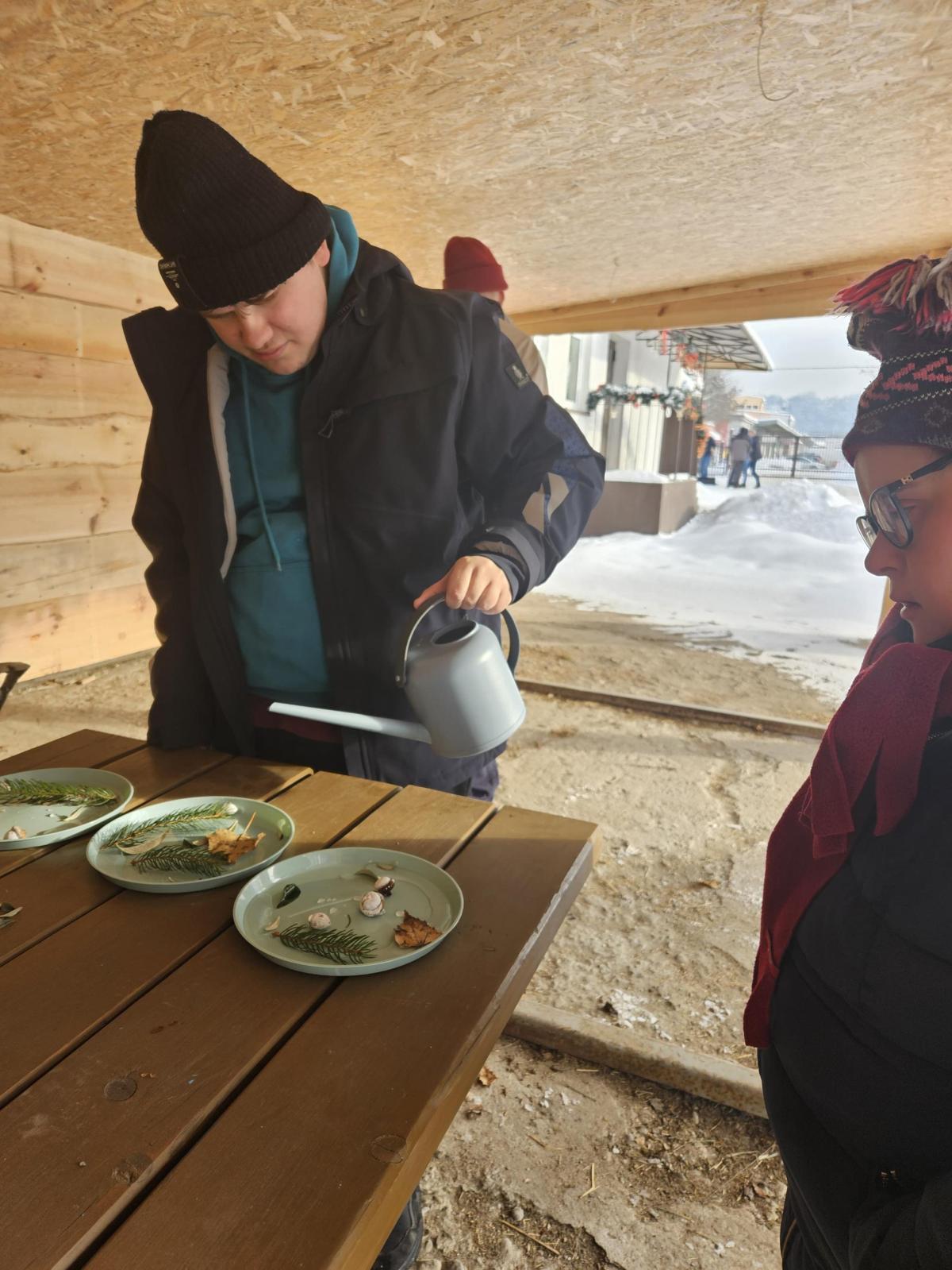 Korzystając z mroźnej pogody, uczniowie wykorzystali znalezione podczas spaceru dary natury oraz wodę i stworzyli zimowe witraże. Eksperyment pokazał im, jak zmienia się stan skupienia wody oraz jak można wykorzystać te właściwości do tworzenia ciekawych dekoracji. Działanie to rozwijało ciekawość, kreatywność oraz umiejętność obserwacji.