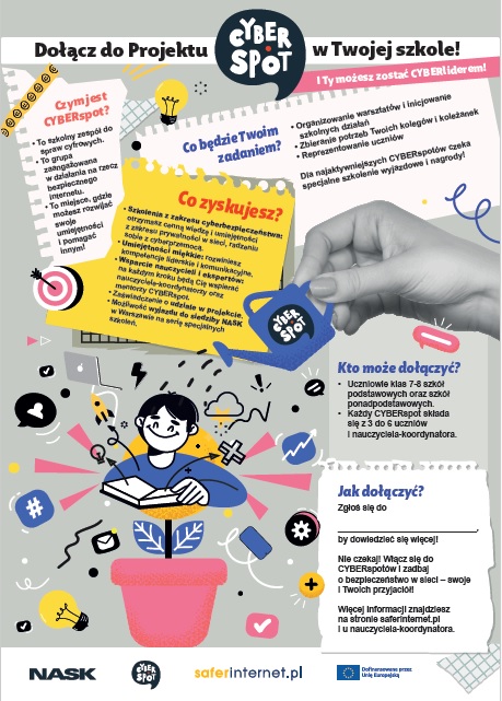 Projekt CYBERspot powstał aby pomóc uczniom bezpiecznie poruszać się w świecie cyfrowym. To innowacyjna inicjatywa tworzenia szkolnych zespołów odpowiedzialnych za szerzenie wiedzy na temat bezpieczeństwa w internecie. W ramach inicjatywy powstała broszura, z której uczniowie dowiedzą się jak dbać o cyfrowy dobrostan i swój wizerunek