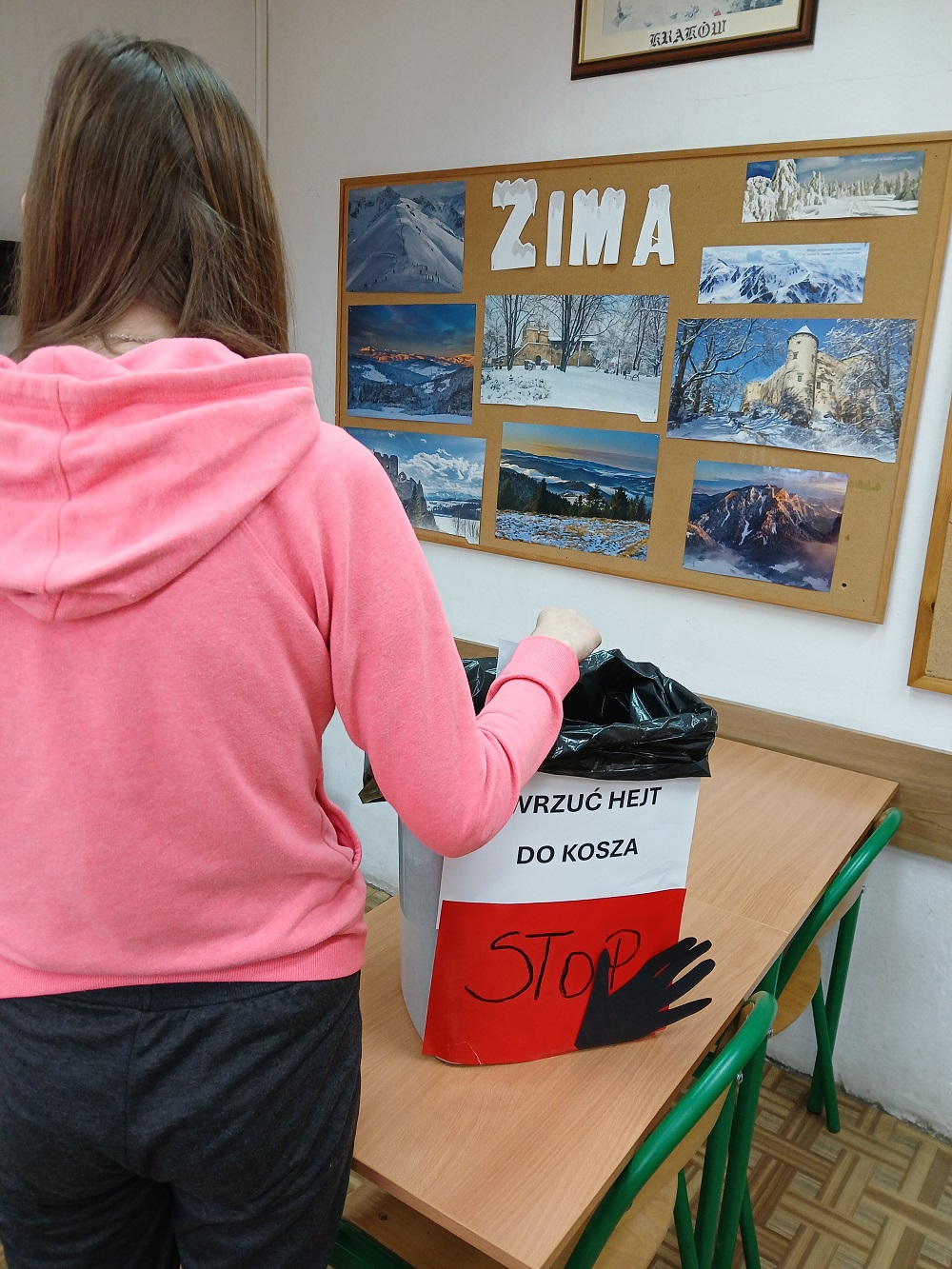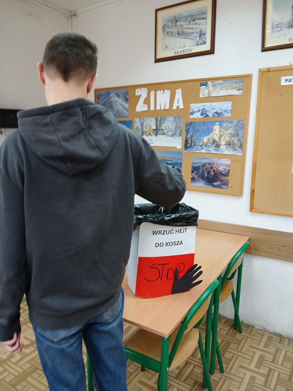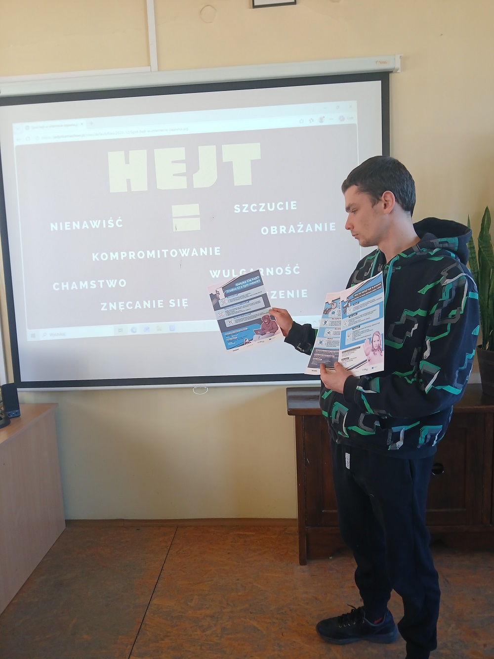 W dniu 02.03.2026 r. CYBERliderzy przeprowadzili akcję „Wrzuć hejt do kosza”, której celem było przeciwdziałanie hejtowi i cyberprzemocy wśród młodzieży. W ramach działań zorganizowane zostały spotkania edukacyjne przez CYBERliderów w salach, podczas których uczniowie dowiedzieli się, czym jest hejt, jakie niesie konsekwencje oraz jak reagować na mowę nienawiści. Po prezentacji multimedialnej nt. hejtu CYBERliderzy zaprezentowali, a następnie wręczali uczniom ulotki dla osoby doświadczającej hejt, dla świadka oraz dla sprawcy. Symbolicznym elementem akcji było „wyrzucanie hejtu do kosza” – uczniowie zapisali na kartkach przykłady obraźliwych komentarzy lub negatywnych emocji, a następnie wrzucili je do kosza jako znak sprzeciwu wobec mowy nienawiści. Akcja promowała kulturę szacunku, odpowiedzialność za słowo oraz świadome korzystanie z internetu.