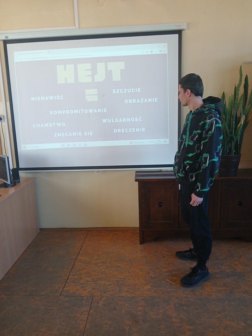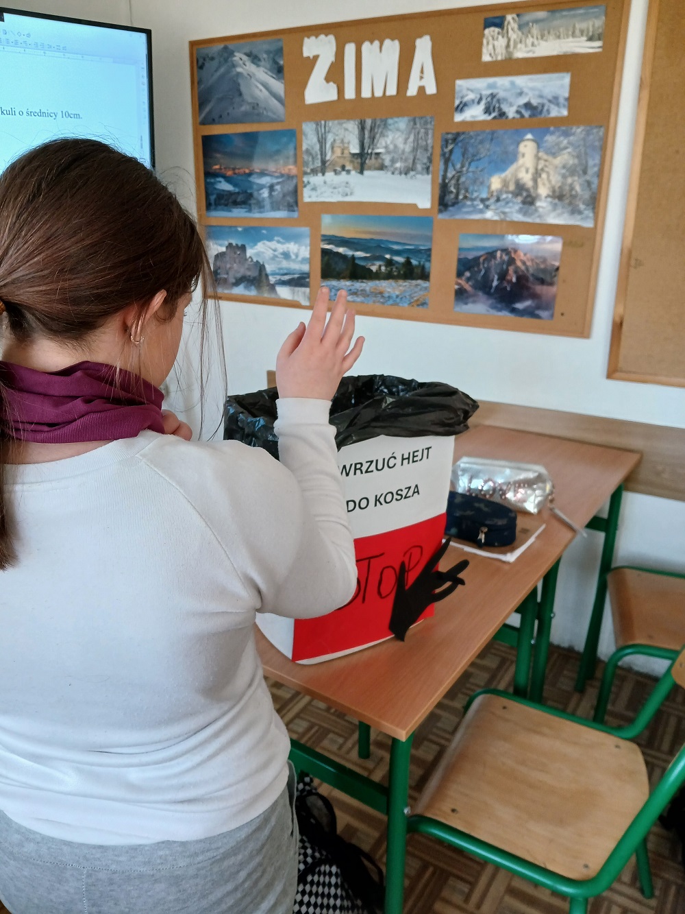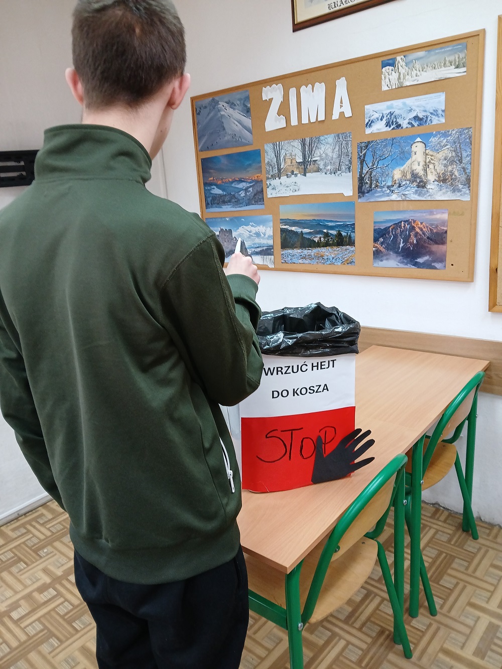 W dniu 02.03.2026 r. CYBERliderzy przeprowadzili akcję „Wrzuć hejt do kosza”, której celem było przeciwdziałanie hejtowi i cyberprzemocy wśród młodzieży. W ramach działań zorganizowane zostały spotkania edukacyjne przez CYBERliderów w salach, podczas których uczniowie dowiedzieli się, czym jest hejt, jakie niesie konsekwencje oraz jak reagować na mowę nienawiści. Po prezentacji multimedialnej nt. hejtu CYBERliderzy zaprezentowali, a następnie wręczali uczniom ulotki dla osoby doświadczającej hejt, dla świadka oraz dla sprawcy. Symbolicznym elementem akcji było „wyrzucanie hejtu do kosza” – uczniowie zapisali na kartkach przykłady obraźliwych komentarzy lub negatywnych emocji, a następnie wrzucili je do kosza jako znak sprzeciwu wobec mowy nienawiści. Akcja promowała kulturę szacunku, odpowiedzialność za słowo oraz świadome korzystanie z internetu.