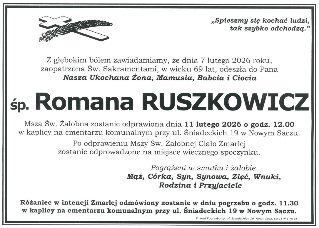 Msza św. 11.02.2026 r. o godz. 12.00 w kaplicy na cmentarzu komunalnym przy ul. Śniadeckich w Nowym Sączu. Różaniec o godz. 11.30.